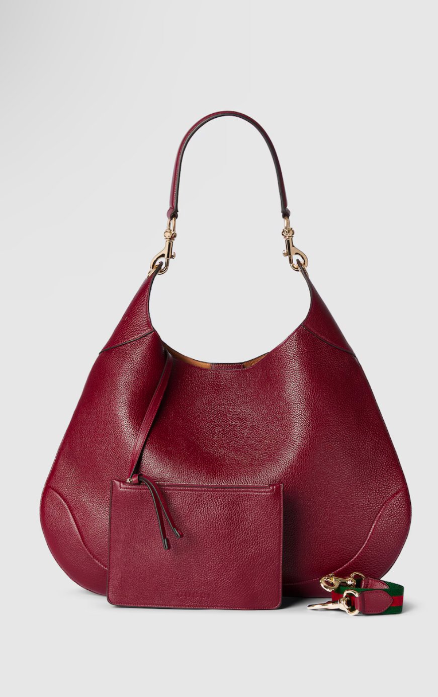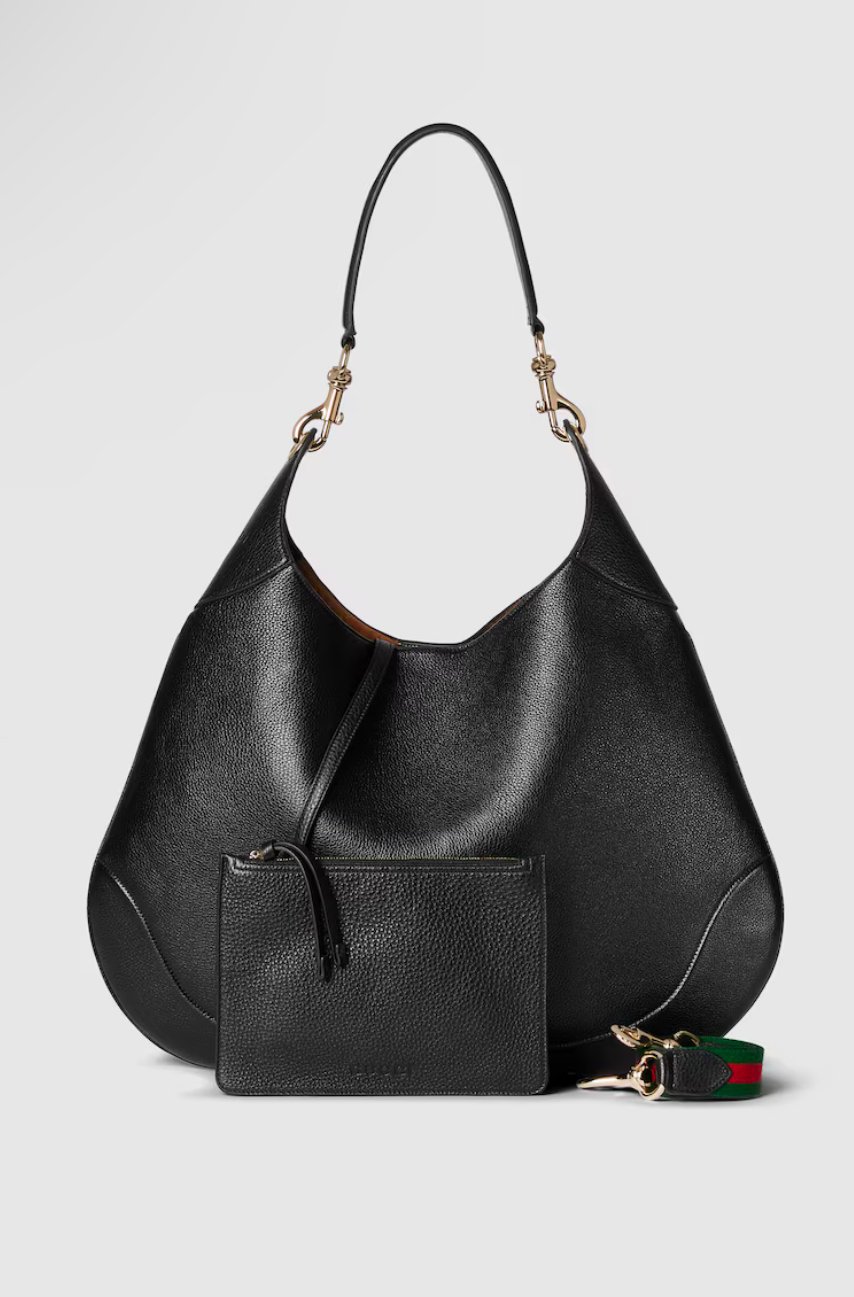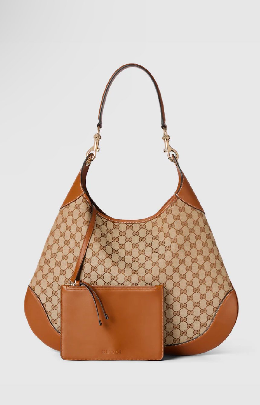 Introducing the Gucci B half moon handbag. Available in Black, Red or Brown with GG Canvas
