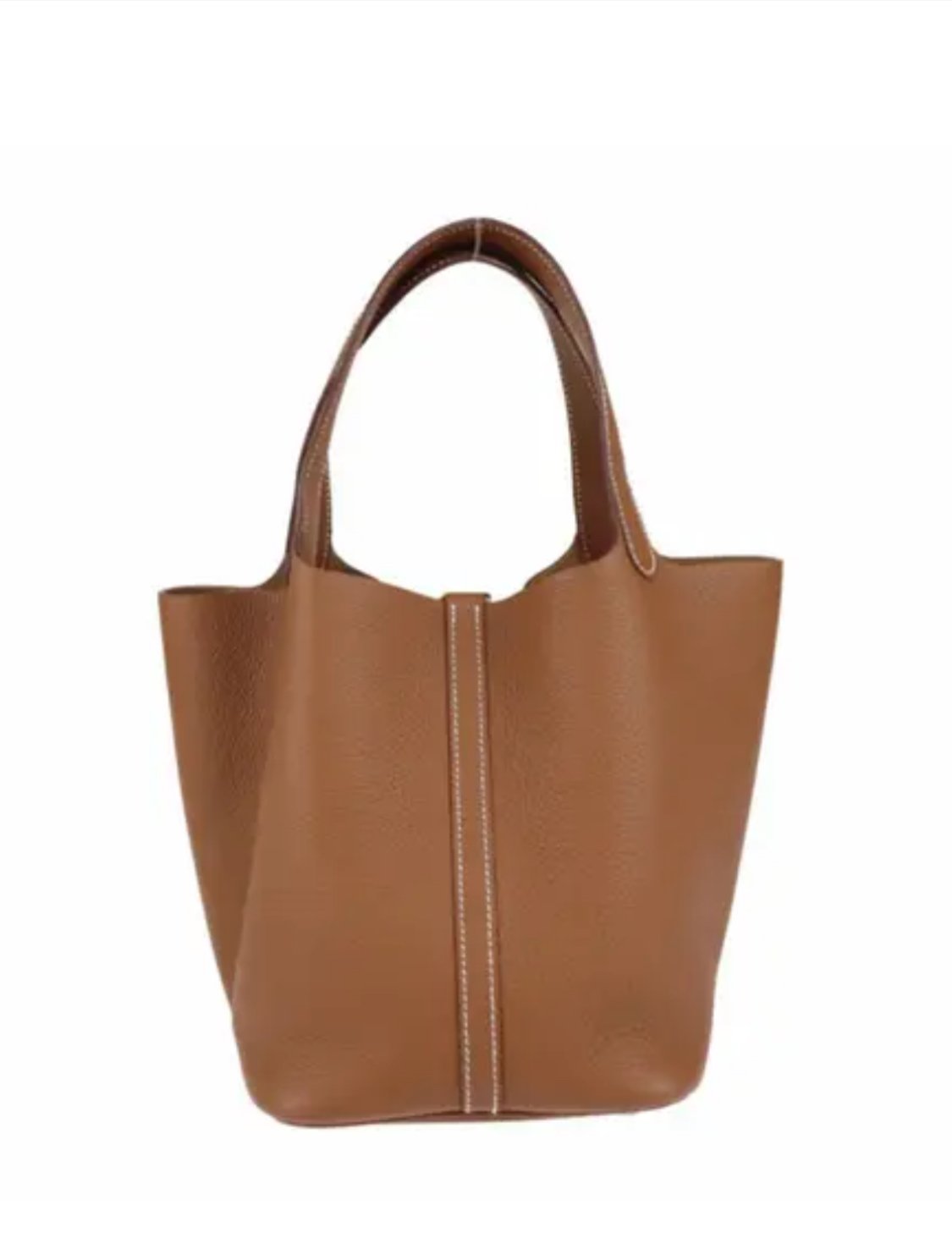 Introducing the Inspired Hermes Picotin Lock 22 bag, crafted from supple brown leather and adorned with exquisite silver hardware. This chic accessory boasts dimensions of 8.7″ in length, 8.3″ in height, and 6.7″ in depth, showcasing both style and sophistication.